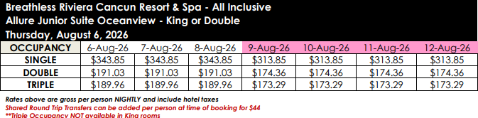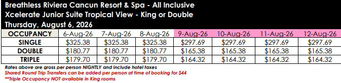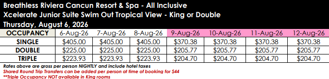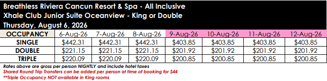The discounted rate is an ALL-INCLUSIVE room rate and includes shared nonstop roundtrip airport transfer. So, there is no need to arrange a taxi when arriving or leaving Cancun Intl Airport.
